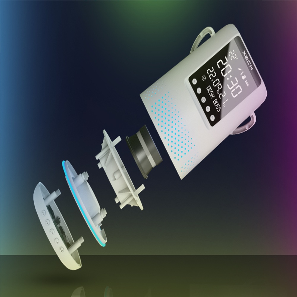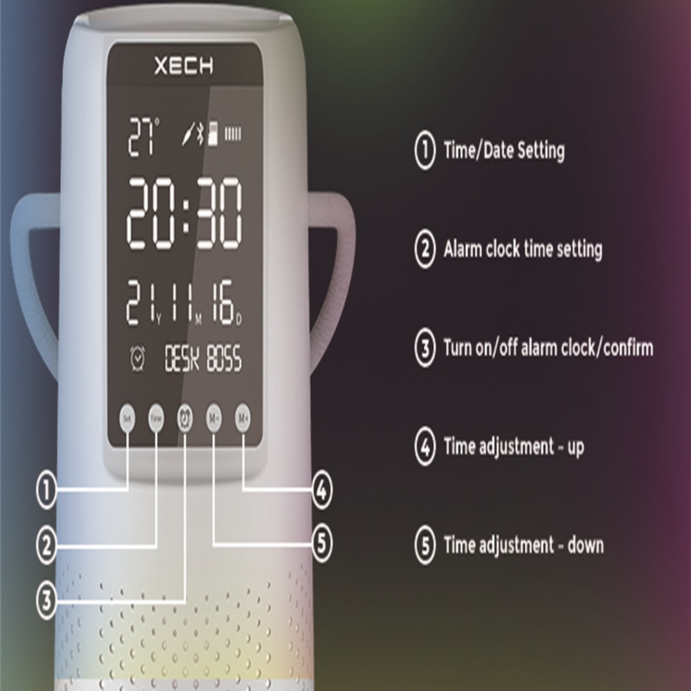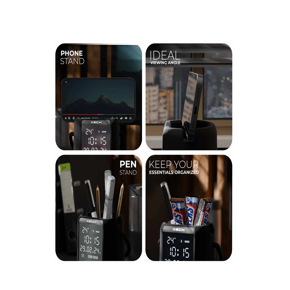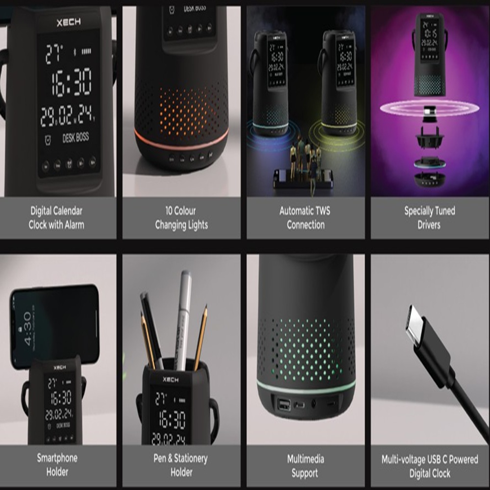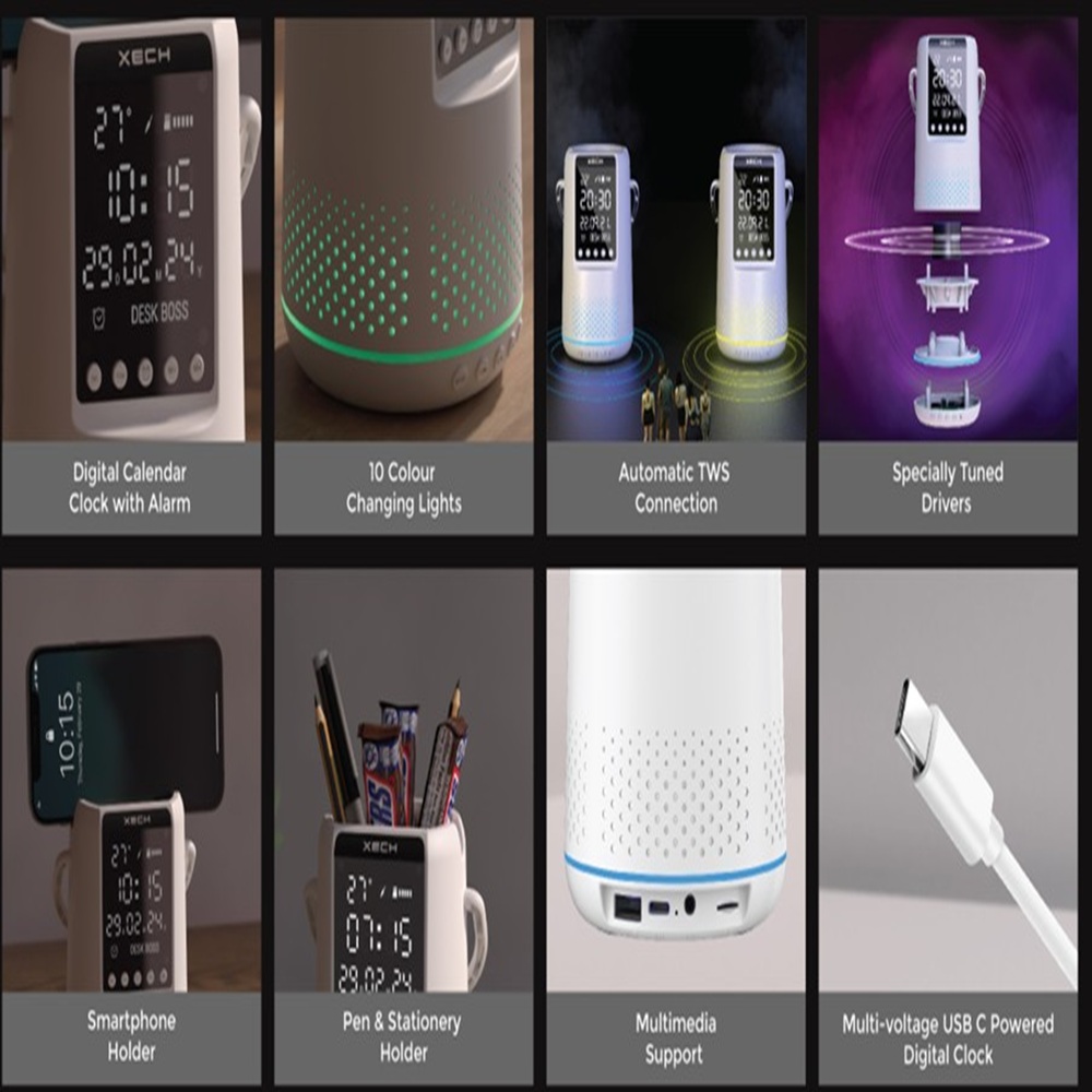 XECH Desk Boss is a multifunctional Bluetooth speaker with a phone holder. It also features a mirror finish digital clock with alarm & ambient temperature. It also has colour-changing RGB lights located at the base of the speaker to keep the good vibes up, always!