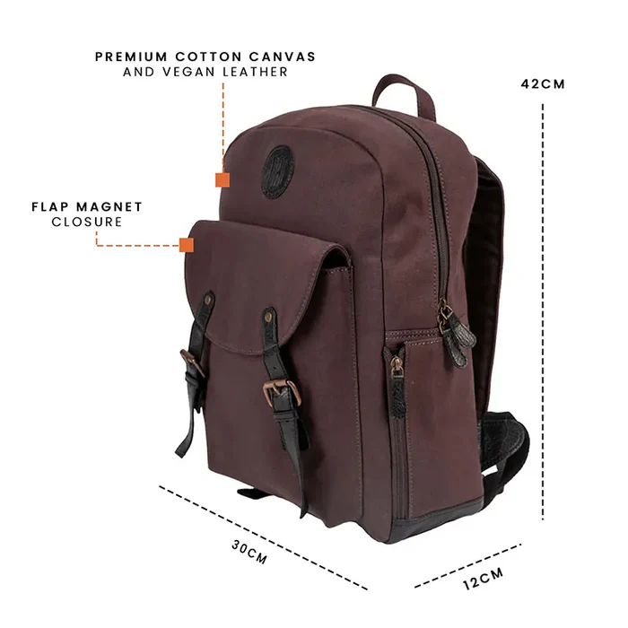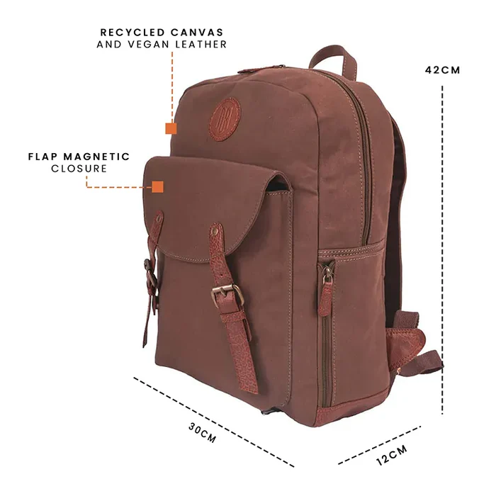 - Sleek front pocket made of premium cotton canvas, features magnetic buttons with vegan leather straps