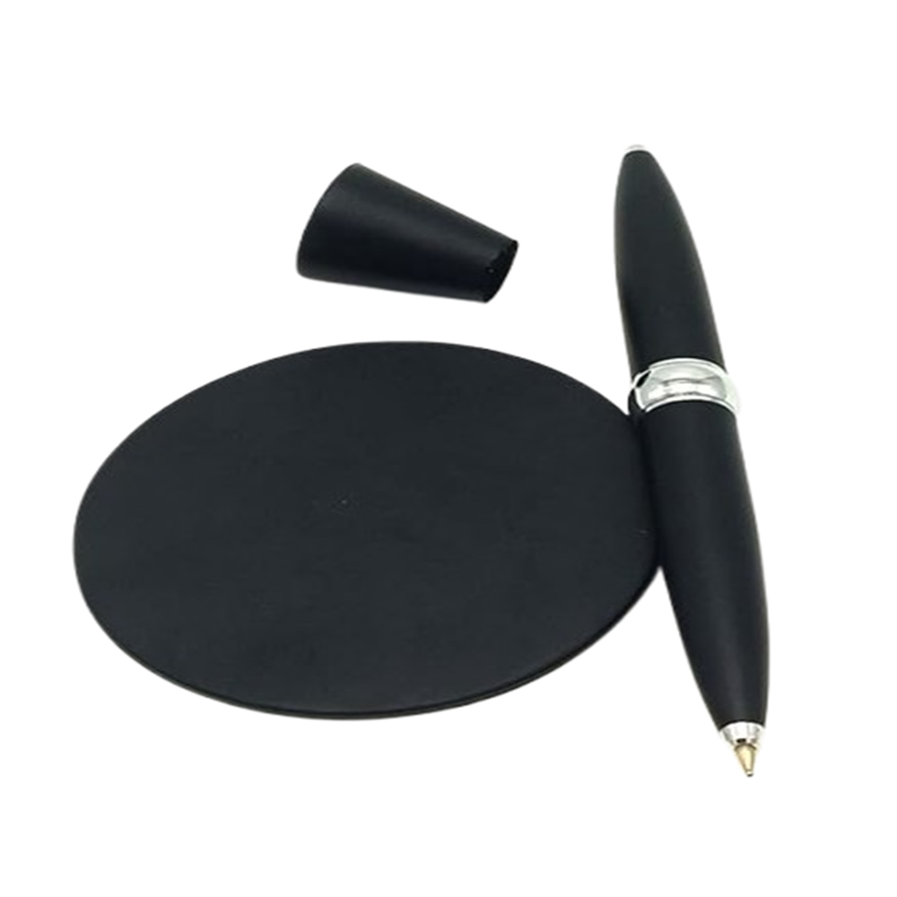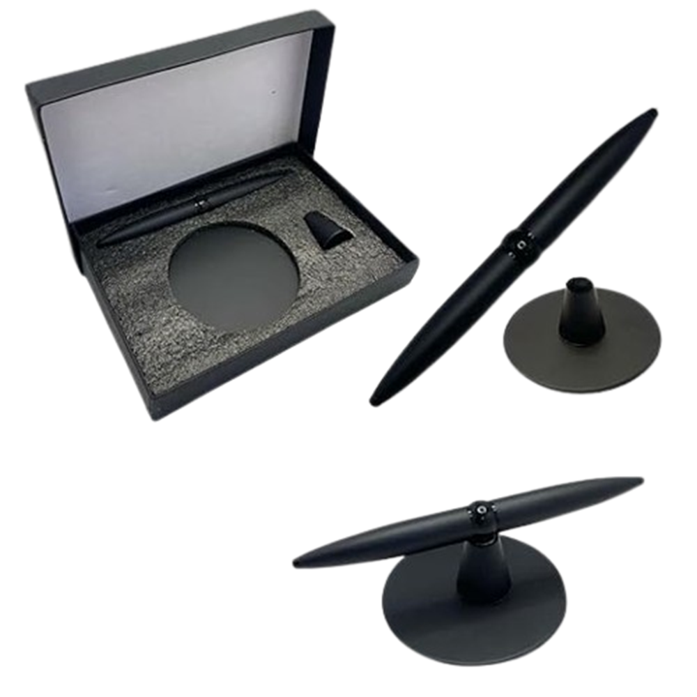This image shows a revolving 2-in-1 ball pen with a magnetic stand, also referred to as a “floating pen” or “hoverpen” due to its design.