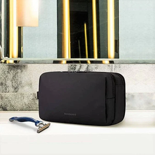 The main compartment has three mesh pockets and an elastic band to keep the bottles upright and well organized. The U-shaped double zipper closure with magnetic buckle provides a clear view of your cosmetics while traveling and easy access to items. A wide carrying strap makes the toiletry bag easy to carry and clean. This bag can be used as a toiletry bag or as a wash bag for bathroom accessories and cosmetics, making it suitable for men and women.