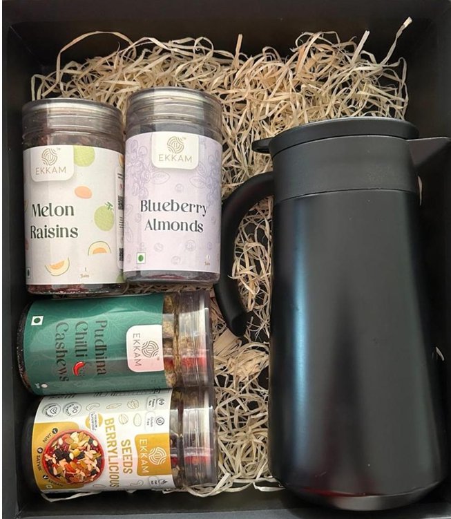 - EKKAM Products: The jars contain “Melon Raisins,” “Blueberry Almonds,” “Pudhina Chilli Cashews,” and “SEEDS BERRYLICIOUS” from the brand EKKAM, which offers a range of healthy snacks.