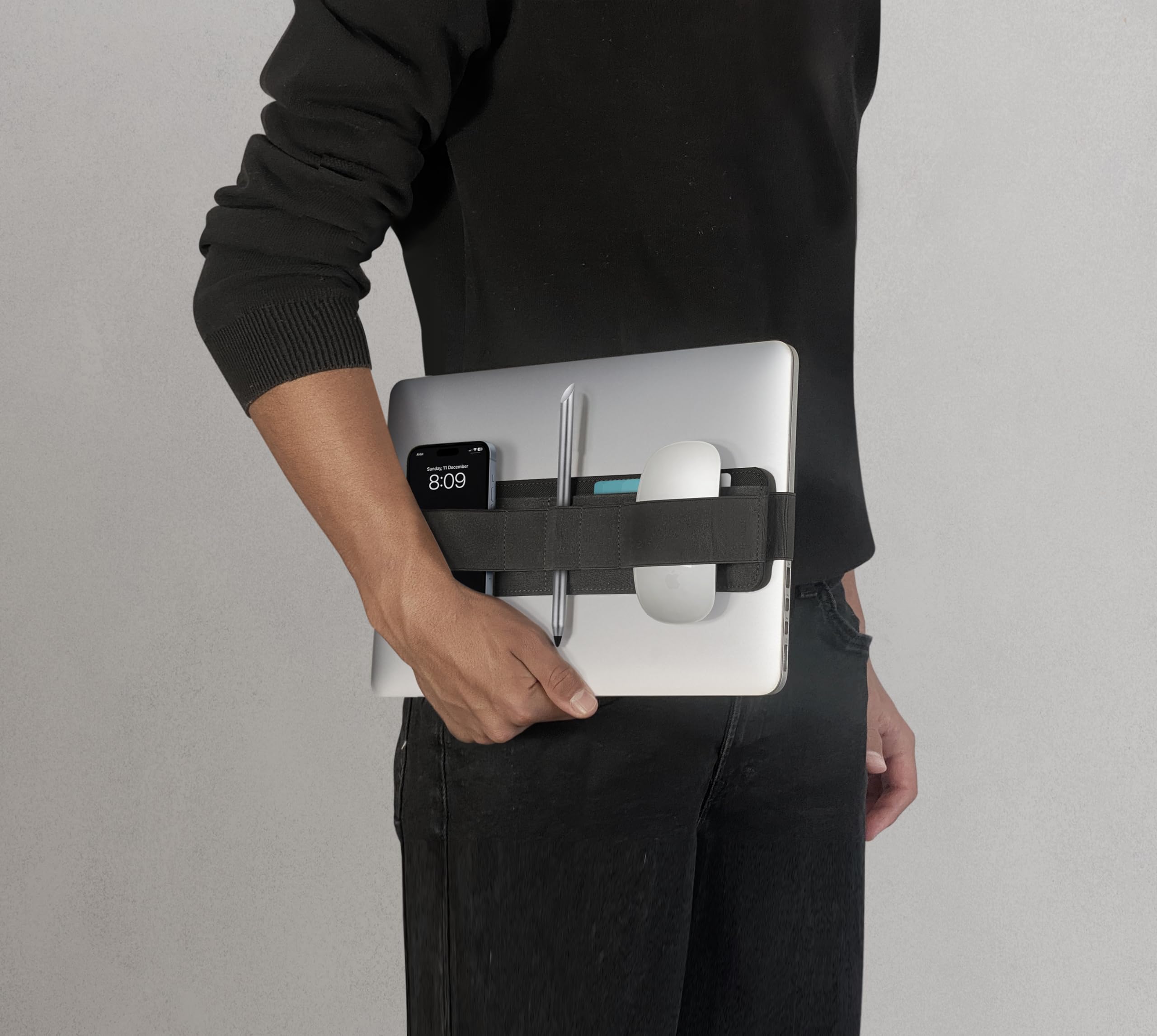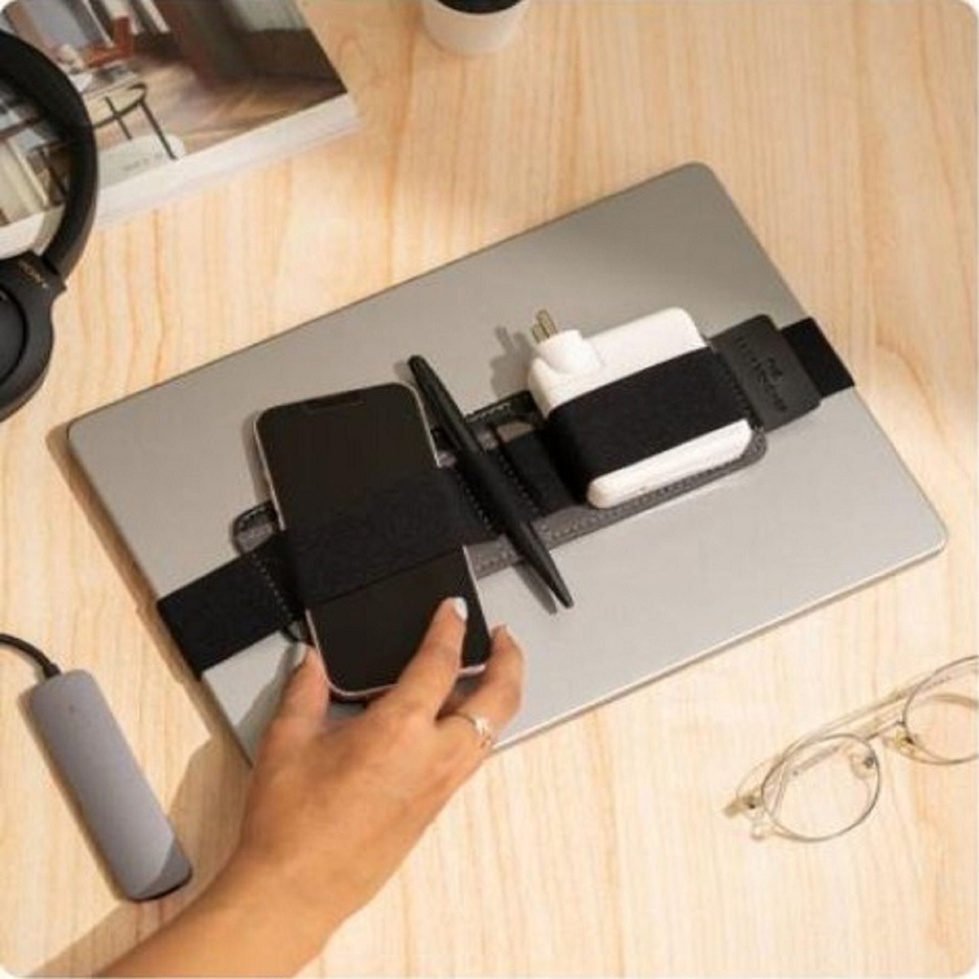 Crafted to cater to the modern professional’s dynamic lifestyle, the urban Tech Grip is a sleek yet robust belt that elegantly sits over your closed laptop, offering a dedicated space for all your work essentials.